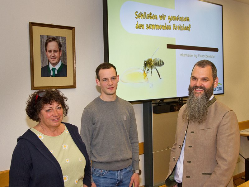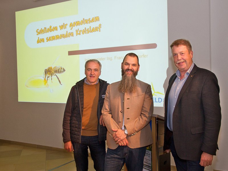 Die letzten Wochen und Monate waren geprägt von unserer kleinen Vortrags-Tournee im Weinviertel unter dem Motto "Ein summender Kreislauf". Im Schloss Liechtenstein Wilfersdorf, dem Veranstaltungssaal der Bezirksbauernkammer Mistelbach und im Festsaal der Marktgemeinde Asparn/Zaya konnte Bio-Imker Franz Obendorfer an 3 Abenden viele interessierte Gäste begrüßen. Unter anderem die beiden Bürgermeister der Marktgemeinden Wilfersdorf und Asparn/Zaya, Josef Tatzber und Manfred Meixner, weiters die Gemeinderätinnen Martina Pürkl (Mistelbach) und Sonja Klampfl (Asparn/Zaya), von der Bezirksbauernkammer Mistelbach den Obmann Roman Bayer und den Pflanzenbauberater Franz Summhammer, sowie vom Sponsor Windkraft Simonsfeld AG den Vorstand Markus Winter.