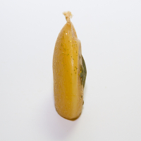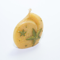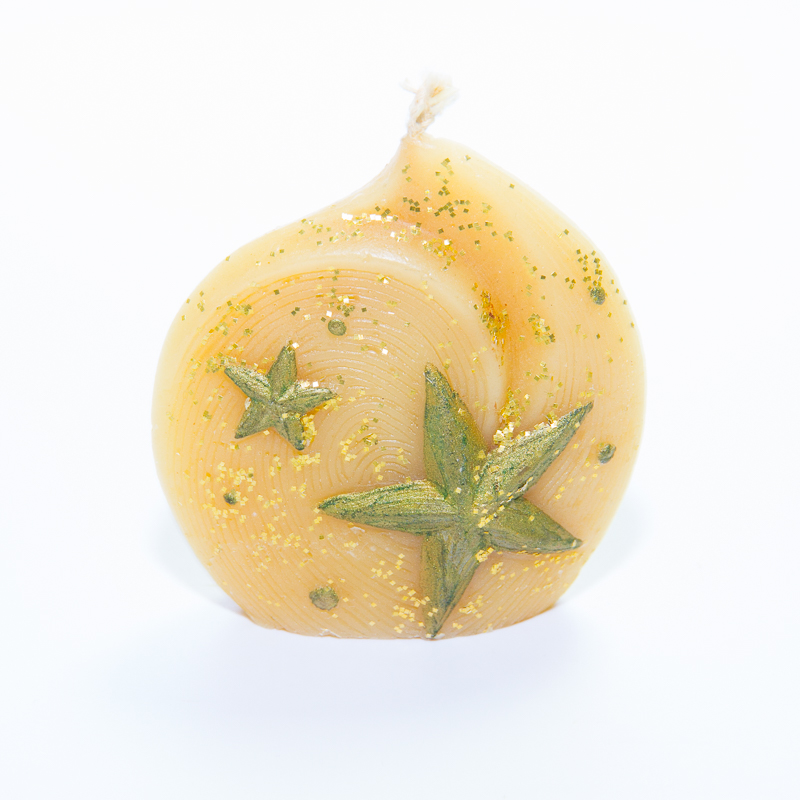 Schmale Kerze aus 100% Bienenwachs in Tropfenform mit Sternen und bemalt.